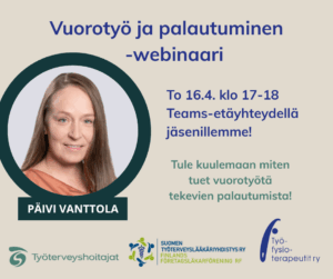 Työfysioterapeutit ry järjestää 16.4.2026 klo 17–18 yhdessä Työterveyshoitajaliiton ja Suomen Työterveyslääkärit -yhdistyksen kanssa webinaarin